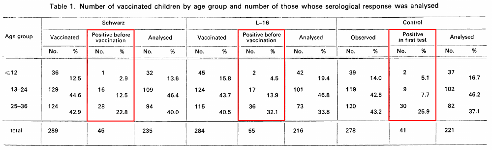 Do badania wybrano dzieci, które pochodziły ze środowisk, gdzie przebywały w dużych grupach przez długi czas (żłobki) lub cały czas (sierocińce), nie chorowały na odrę i były w wieku od 9 miesięcy do 3 lat. Dla porównania skuteczności szczepionek pobrano krew od wszystkich dzieci jeszcze przed zaszczepieniem. Jak działały szczepionki, teraz nas nie interesuje. Istotne jest to, co wykazało badanie krwi NIEZASZCZEPIONYCH dzieci, które NIE CHOROWAŁY na odrę.