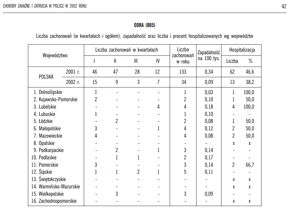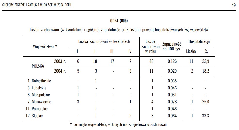 O stosunkowo niskiej czułości systemu nadzoru nad odrą w Polsce świadczy także fakt, że aż 31 zachorowań (91%) zarejestrowanych w 2002 r. to przypadki rozproszone, izolowane, w których nie ustalono źródła zakażenia. Oznacza to, że co najmniej 31 innych zachorowań nie zostało wykrytych lub nie zostało zgłoszonych.