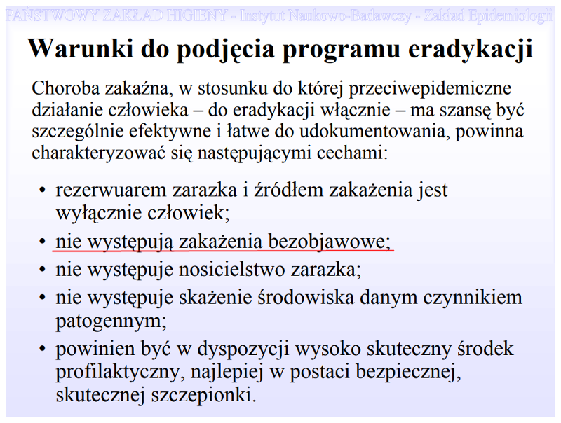 A teraz przechodzimy do clou. Według WHO, choroba musi posiadać pewne konkretne cechy, żeby można było ją eradykować. Takie cechy posiadała ospa prawdziwa.