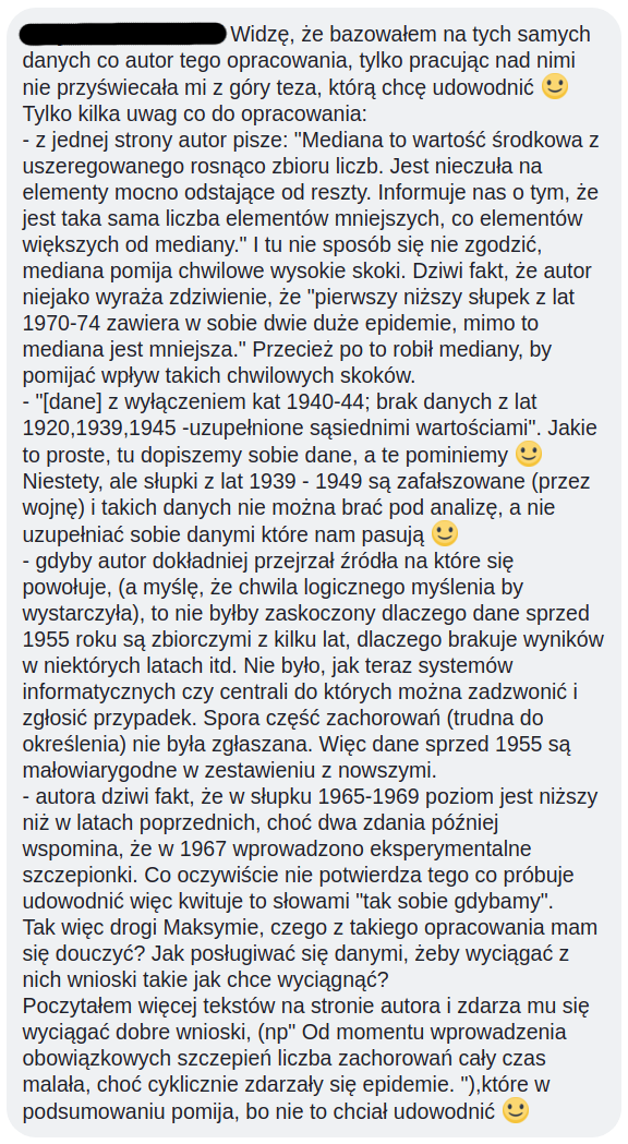 1. Czytelnik uważa, że moje zdziwienie niższą medianą jest niedorzeczne, bo przecież celowo użyłam median, by pominąć lata epidemiczne. Po pierwsze źle zrozumiał, z czego wynikało moje zdziwienie, po drugie użycie median zostało mi niejako narzucone, bo tak dane zapisywane są w książkach. Jest to powszechna praktyka, a nie moja manipulacja.