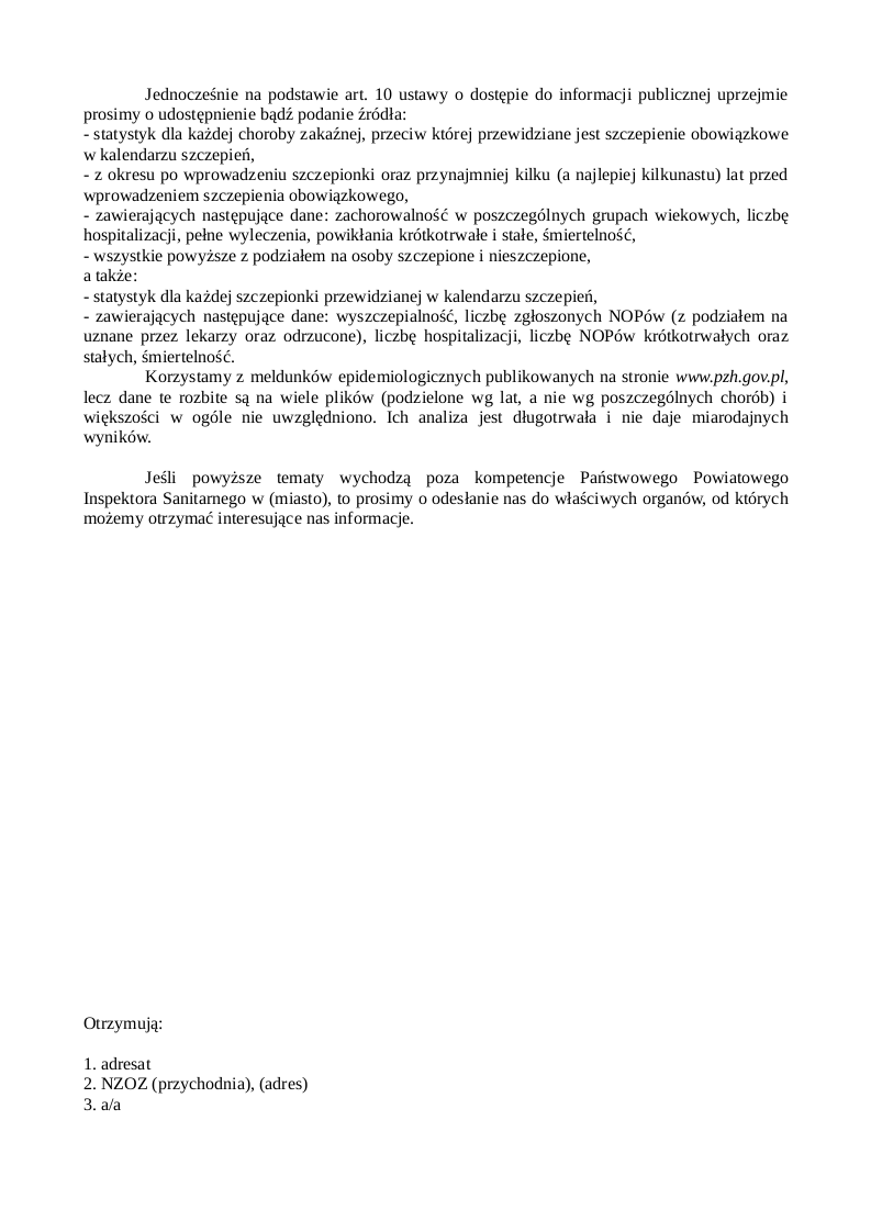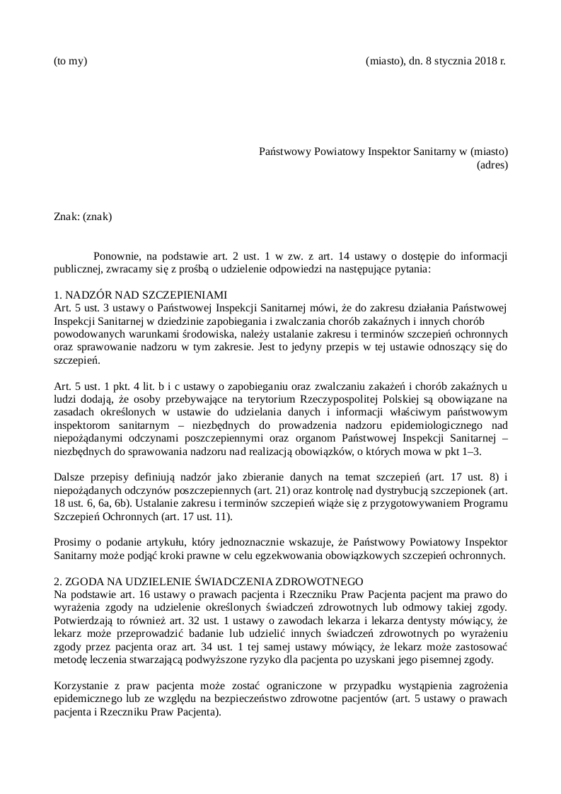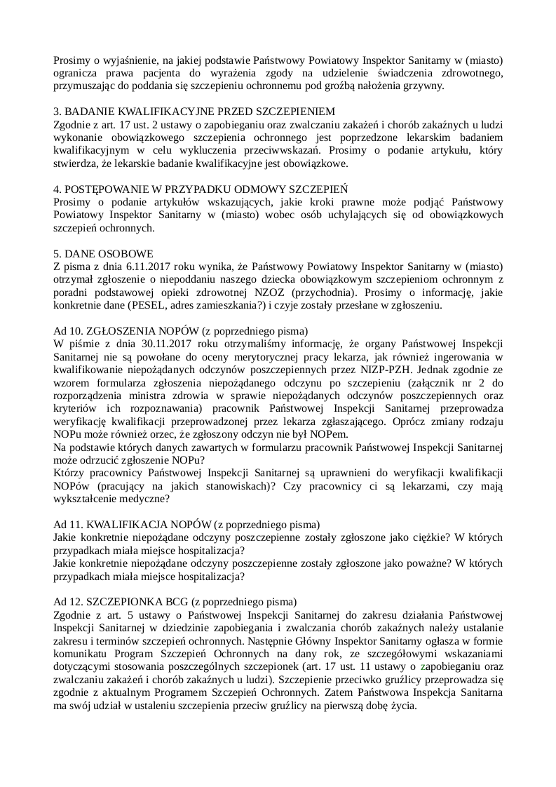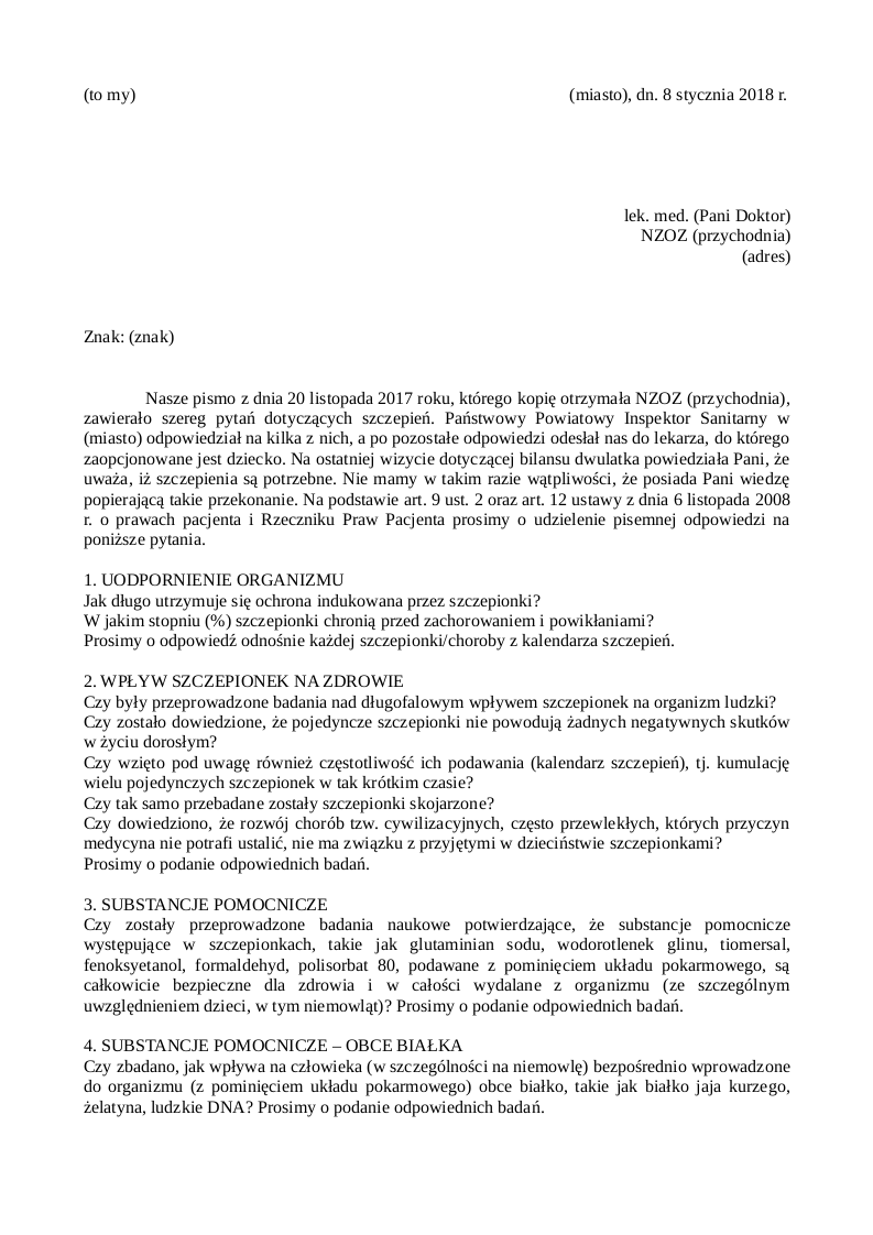 Nasze pismo z dnia 20 listopada 2017 roku, którego kopię otrzymała NZOZ (przychodnia), zawierało szereg pytań dotyczących szczepień. Państwowy Powiatowy Inspektor Sanitarny w (miasto) odpowiedział na kilka z nich, a po pozostałe odpowiedzi odesłał nas do lekarza, do którego zaopcjonowane jest dziecko. Na ostatniej wizycie dotyczącej bilansu dwulatka powiedziała Pani, że uważa, iż szczepienia są potrzebne. Nie mamy w takim razie wątpliwości, że posiada Pani wiedzę popierającą takie przekonanie. Na podstawie art. 9 ust. 2 oraz art. 12 ustawy z dnia 6 listopada 2008 r. o prawach pacjenta i Rzeczniku Praw Pacjenta prosimy o udzielenie pisemnej odpowiedzi na poniższe pytania.