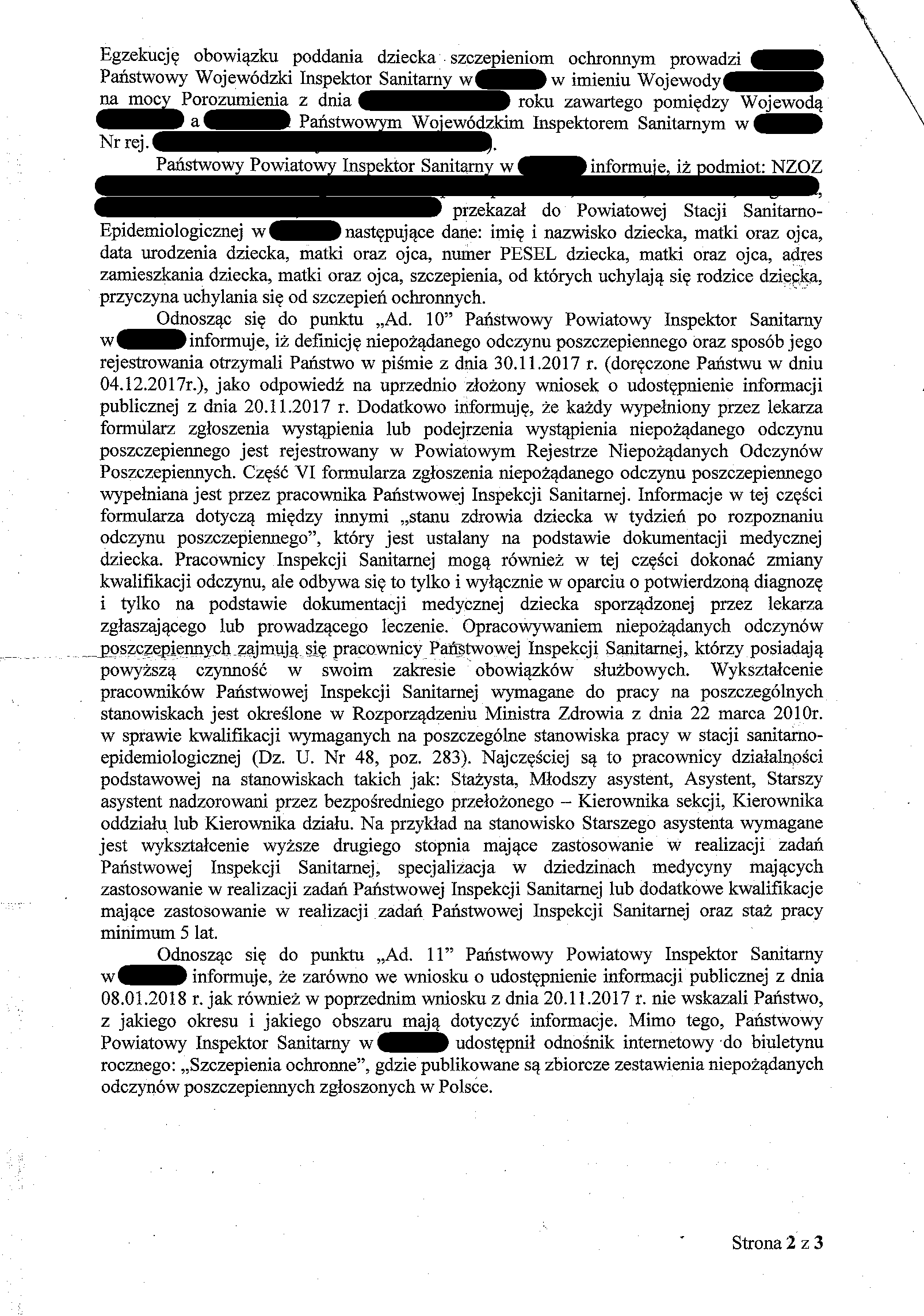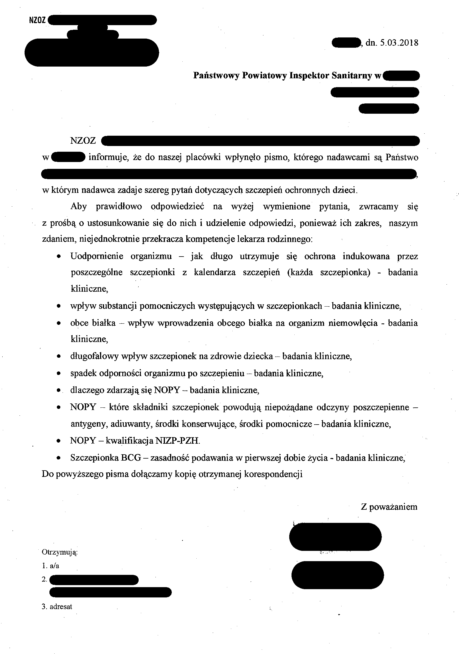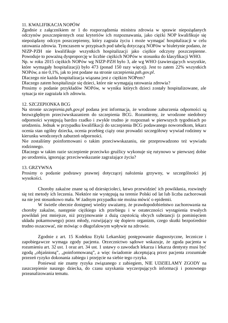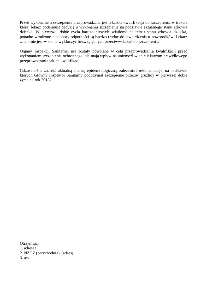 Nasze pismo z dnia 20 listopada 2017 roku, którego kopię otrzymała NZOZ (przychodnia), zawierało szereg pytań dotyczących szczepień. Państwowy Powiatowy Inspektor Sanitarny w (miasto) odpowiedział na kilka z nich, a po pozostałe odpowiedzi odesłał nas do lekarza, do którego zaopcjonowane jest dziecko. Na ostatniej wizycie dotyczącej bilansu dwulatka powiedziała Pani, że uważa, iż szczepienia są potrzebne. Nie mamy w takim razie wątpliwości, że posiada Pani wiedzę popierającą takie przekonanie. Na podstawie art. 9 ust. 2 oraz art. 12 ustawy z dnia 6 listopada 2008 r. o prawach pacjenta i Rzeczniku Praw Pacjenta prosimy o udzielenie pisemnej odpowiedzi na poniższe pytania.