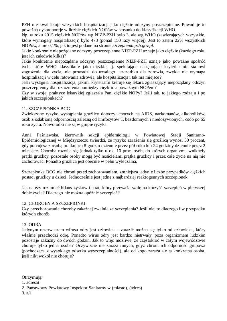 Za radą STOP NOP, w odpowiedzi wysłałam pismo z pytaniami. Miałam napisać, że teraz wysłałabym inne pytania, a jak tak je czytam, to nadal uważam, że są sensowne. Było to 13 głównych pytań, ale niektóre zawierały podpunkty. Kilka to były tzw. zapchajdziury, takie, na które i tak znałam odpowiedzi, np. pytanie o dostępność w Polsce szczepionek etycznych albo o kwalifikację do szczepienia BCG. Były też takie, na które naprawdę chciałabym poznać odpowiedzi: