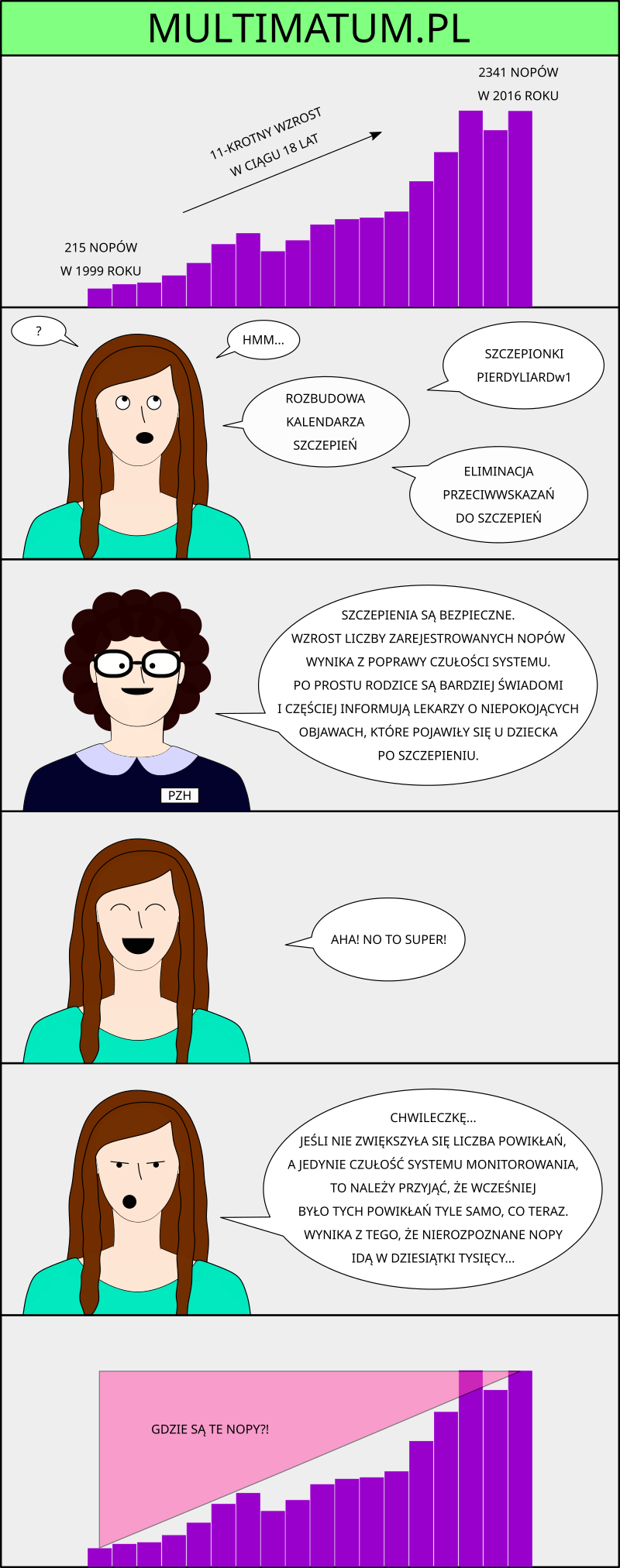 2. Ależ nieeeee. Szczepienia są bezpieczne, a wzrost liczby rejestrowanych NOPów wynika z większej świadomości rodziców i lekarzy, jak mówią. Tylko że paradoksalnie to jest ta gorsza opcja - dla nich. Jeśli nie zwiększyła się liczba powikłań, a jedynie czułość systemu monitorowania, to należy przyjąć, że wcześniej było tych powikłań tyle samo, co teraz. Wynika z tego, że nierozpoznane NOPy idą w dziesiątki tysięcy. A jeśli dołożymy fakt, że i dziś tylko jakiś procent jest rejestrowany, to mamy już setki tysięcy NOPów. Setki tysięcy dzieci poszkodowanych w ciągu 18 lat, z różnym natężeniem. Większość pewnie nawet nie łączy swoich problemów zdrowotnych ze szczepieniami.