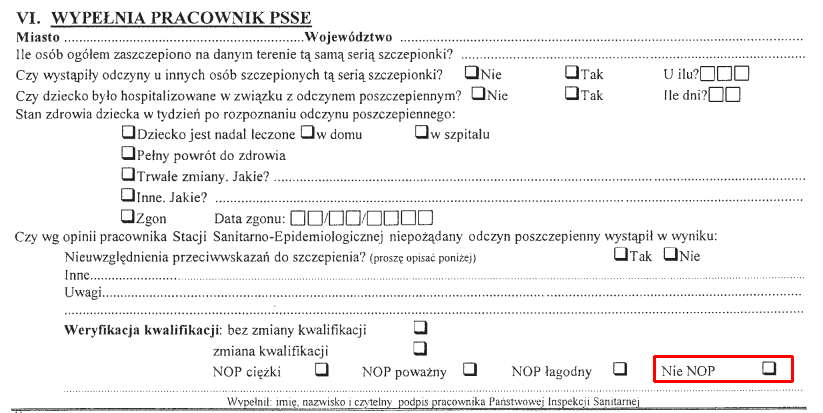 Na końcu formularza znajduje się część o nazwie weryfikacja klasyfikacji i można tam zaznaczyć okienko Nie NOP - część tę wypełnia pracownik Państwowej Inspekcji Sanitarnej. Z formularza i treści rozporządzenia wynika, że po tygodniu od zgłoszenia pracownik PSSE zbiera dane o bieżącym stanie zdrowia dziecka i uzupełnia rubryki (dodatkowo w części V przeprowadza wywiad w punkcie szczepień dotyczący m. in. nazwy, nr serii i daty ważności szczepionki, temperatury przechowywania czy techniki szczepienia). Dwukrotnie pytałam sanepid o procedurę zgłaszania NOPów. Po pierwszym pytaniu otrzymałam następującą odpowiedź: