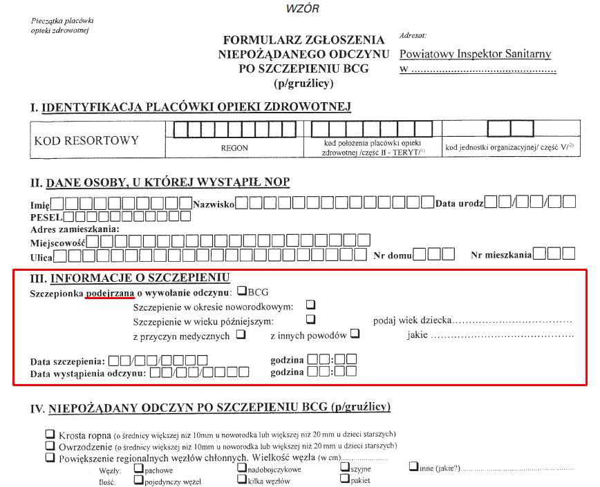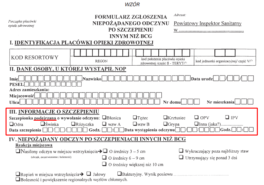 2. Każdy lekarz ma obowiązek zgłaszania podejrzenia/rozpoznania NOP do państwowego powiatowego inspektora sanitarnego właściwego dla miejsca wystąpienia odczynu, na odpowiednim formularzu. [...] Pracownik inspekcji sanitarnej uzupełnia formularz zgłoszenia o informacje zebrane w punkcie szczepień, w którym było wykonane szczepienie, oraz podaje informacje o stanie zdrowia osoby szczepionej po tygodniu od daty wystąpienia NOP.