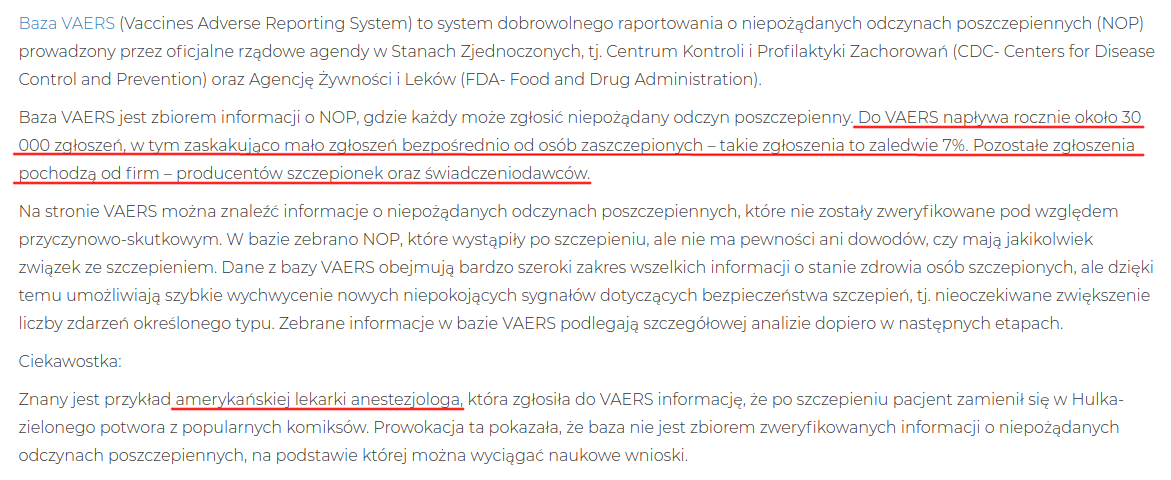 Analizując dane z bazy VAERS trzeba mieć na względzie jej ograniczenia. Zgłoszenia są dobrowolne, więc baza i tak nie zawiera wszystkich objawów niepożądanych. Ponadto zgłoszenia nie są weryfikowane. Oczywiście nie chodzi mi tu o rozstrzyganie, czy dany odczyn wystąpił na skutek podania szczepionki czy też nie, ale sprawdzenie, czy takie zdarzenie rzeczywiście miało miejsce. No i mój główny zarzut - zgłoszenia mogą być anonimowe. Lekarze czy naukowcy, którzy zechcą zająć się analizą objawów niepożądanych, nie są w stanie dotrzeć do poszkodowanych i zebrać dokładniejszych informacji.